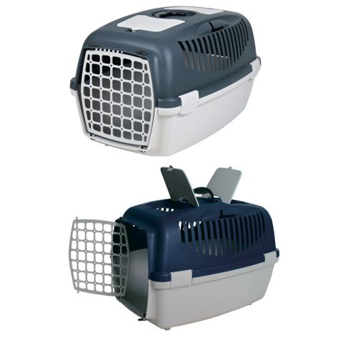 Эта переноска подходит для собак, кошек и других мелких домашних животных. Она изготовлена из пластмассы и имеет несколько пластмассовых же дверей. Через дверцу на крыше переноски вы можете приласкать свое животное или угостить его лакомством. Эта переноска идеальна для поездок к ветеринару и коротких поездок. Также на переноске есть крепление для автомобильных ремней безопасности.
